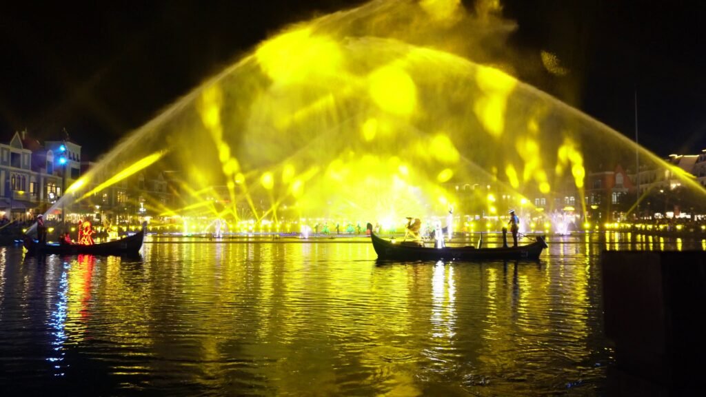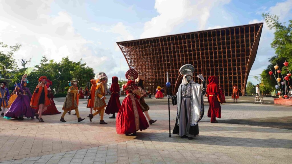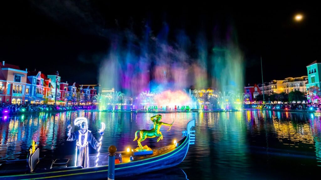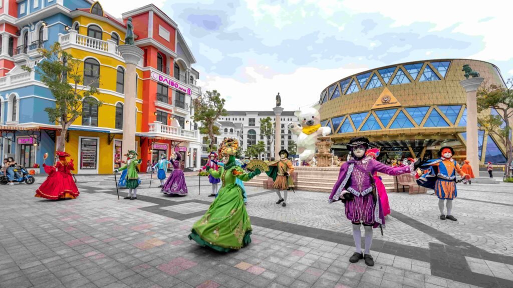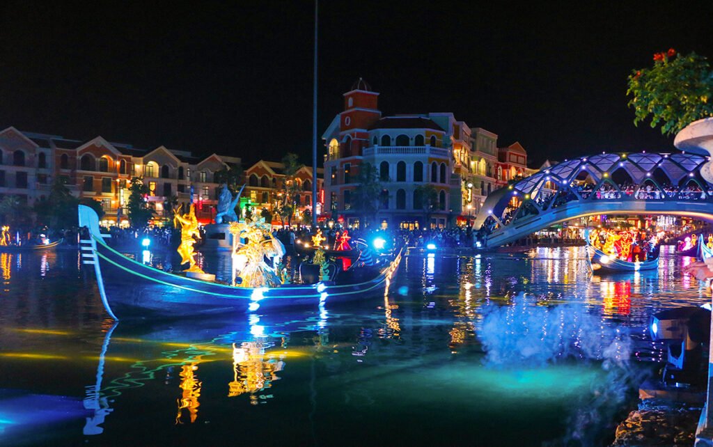 Show Sắc Màu Venice” tại Grand World Phú Quốc tái hiện không khí lễ hội Venice với diễn viên hóa trang, âm nhạc sống động và hiệu ứng ánh sáng ấn tượng.