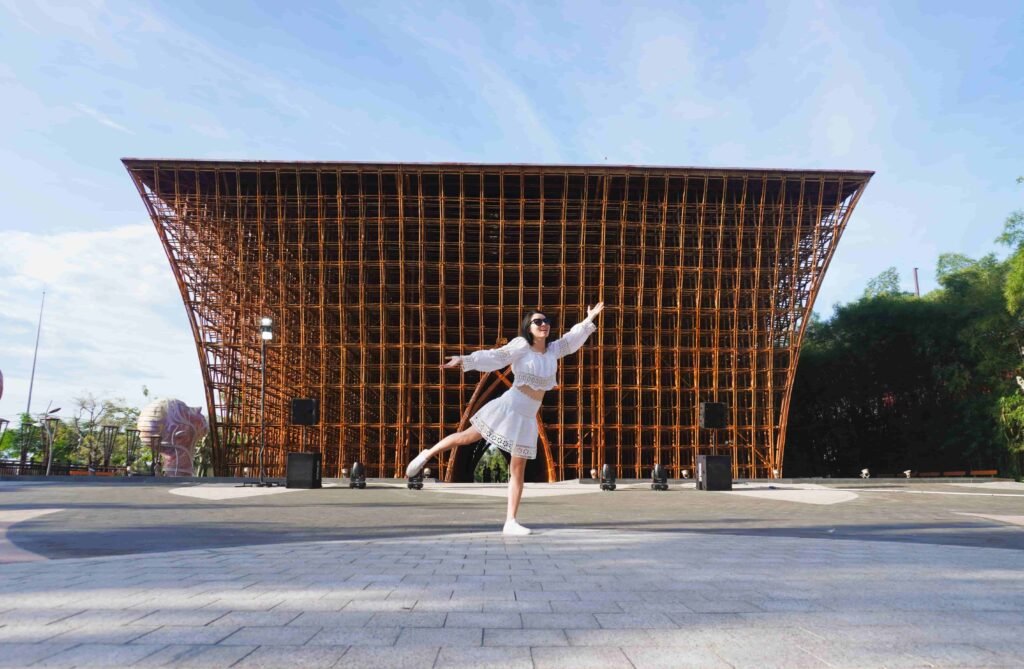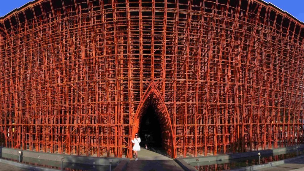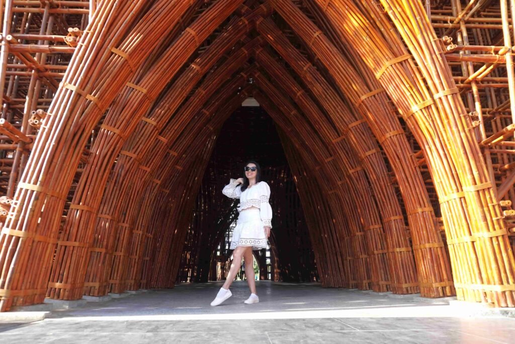 Công trình nhà tre được làm từ 42.000 cây tre tầm vông, với bàn tay tài năng của kiến trúc sư Võ Trọng Nghĩa đã tạo nên một cụm công trình biểu tượng lên đến gần 700m2 và cao 14,4m đồ sộ.